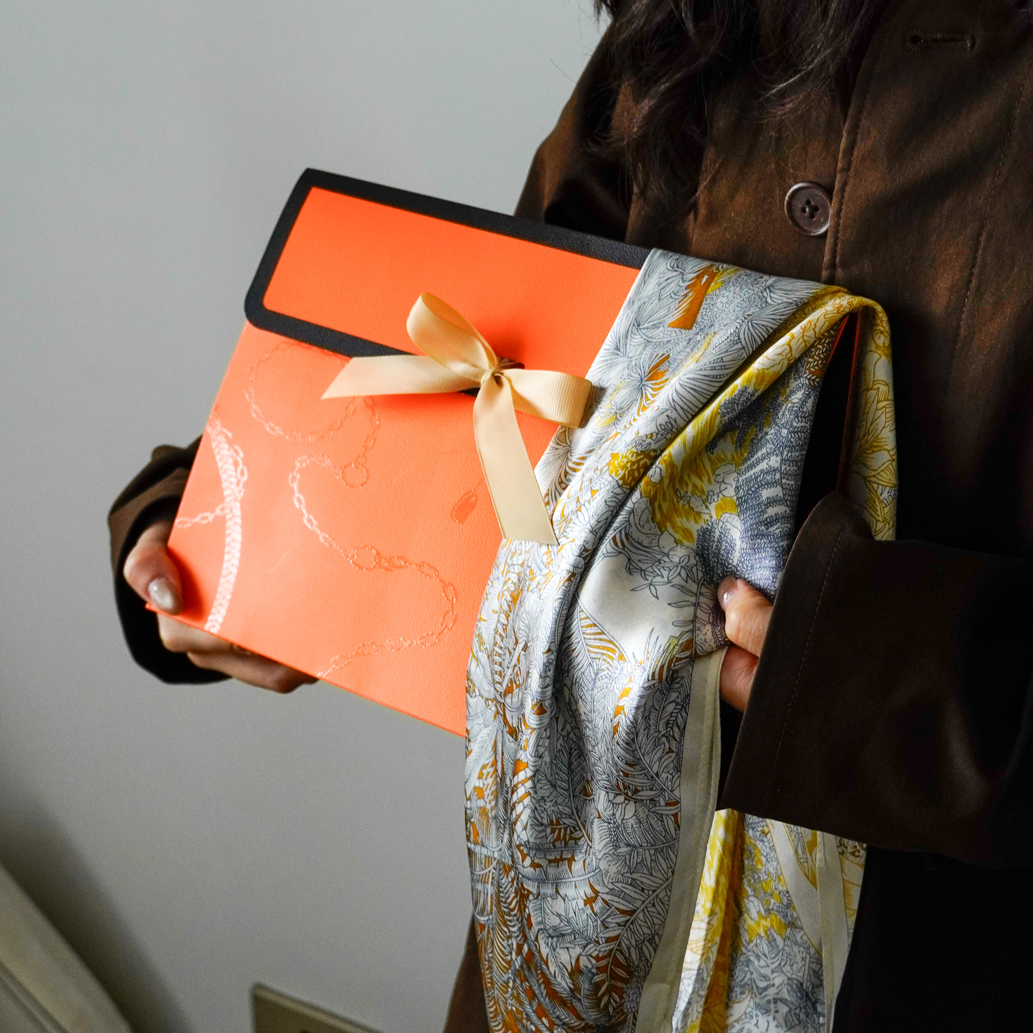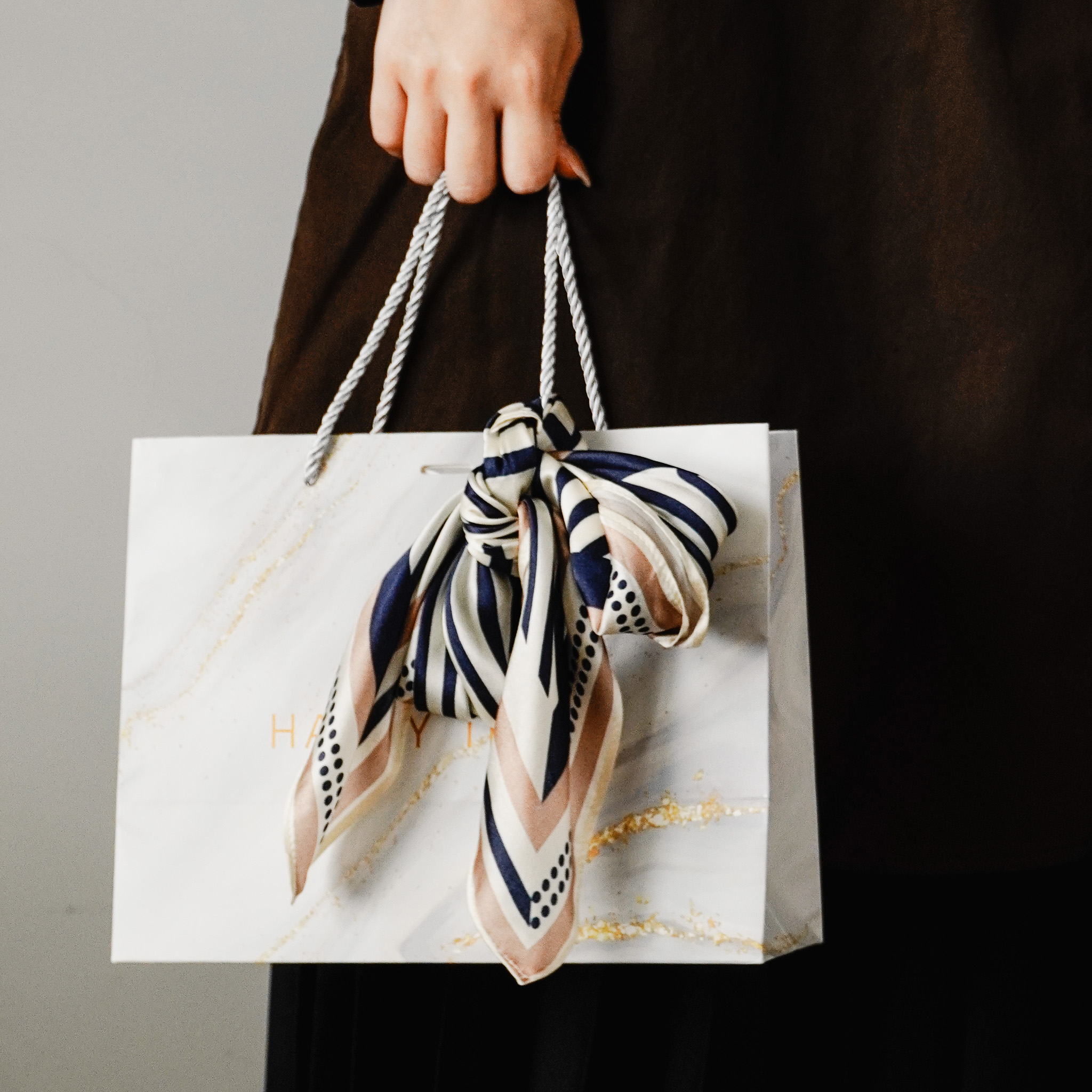 想像一下:晨間咖啡杯在手,脖上輕繫方巾,微微飄動的絲滑質感,整個人都優雅了起來;或是綁在包包手把上,一抹印花色彩瞬間提升整體穿搭層次。