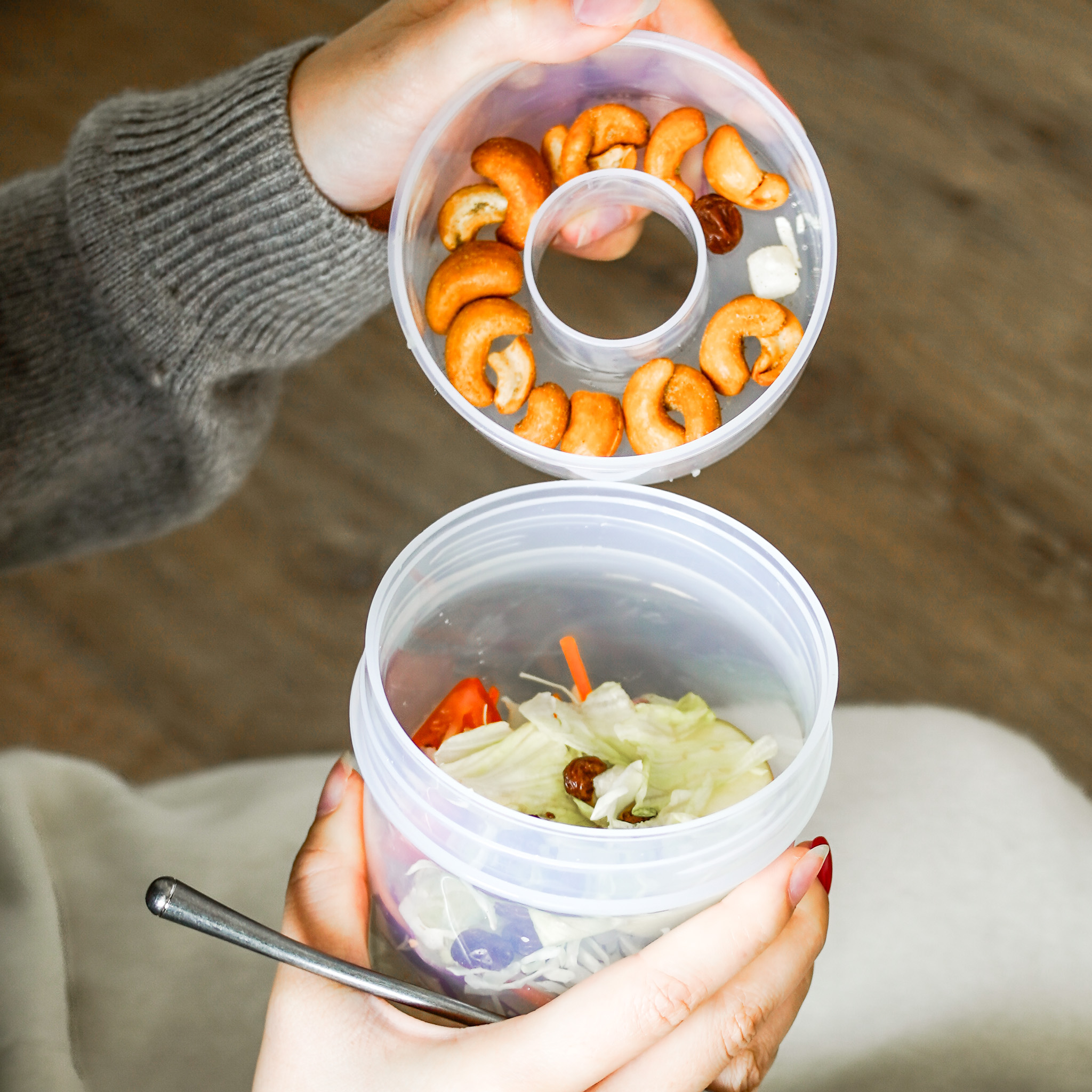 上班路上,打開輕食罐,一層是清脆沙拉,一層是香甜果乾,既方便又安心,讓媽媽也能輕鬆補充營養,不用為吃飯煩惱